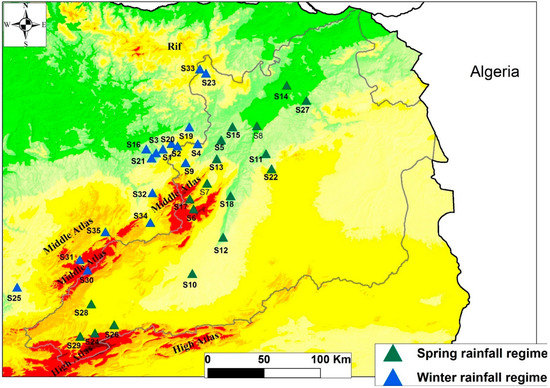 This found spatial heterogeneity made us ask about patterns in the seasonal rainfall regime and its regularity/irregularity with time. Our results show that the two regions have two different rainfall regimes. The first is spring-dominated and characterizes the stations located to the east and the south of the Middle Atlas mountain ranges (Figure 7). This range acts as an obstacle to the humid atmospheric disturbances coming from the north and west of Morocco. The monthly rainfall maximums are generally recorded in April or in March.