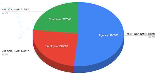 The distribution of the datasets is depicted in Figure 2. The Agency_records contained 493,503 incidents, out of which 15,257 were MIR and 478,246 were NMIR records. The Employee_records contained 245,696 incidents with 3779 MIR and 241,917 NMIR values. The Customer_records had 217,540 incidents with 173 as MIR and 217,367 as NMIR. As observed, the datasets were significantly imbalanced and skewed heavily in favor of NMIR incidents.