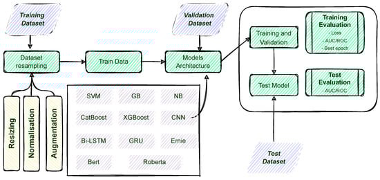 Our comparative pipeline is shown in Figure 4. The first phase of the pipeline was data preparation. As discussed earlier in Section 3, we had performed data augmentation and synthetic resampling on our original dataset. These datasets were split (70% for training and 30% for testing). Using the training data, we had performed supervised training using all 11 classifiers. Specific to the DL-based classifiers, we allocated 20% of our training dataset for training validation using the default Keras model’s fit function. The training phase was performed for 10 epochs with binary_crossentropy as the loss function and AUC as the performance metric. We selected AUC as a metric to prevent over-fitting due to the imbalanced characteristics of our dataset. Finally, the models were tested with the test data (30% of the dataset). Similarly, the AUC score was determined to evaluate the performance of all 11 classifiers.