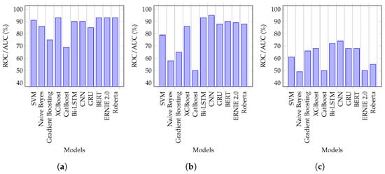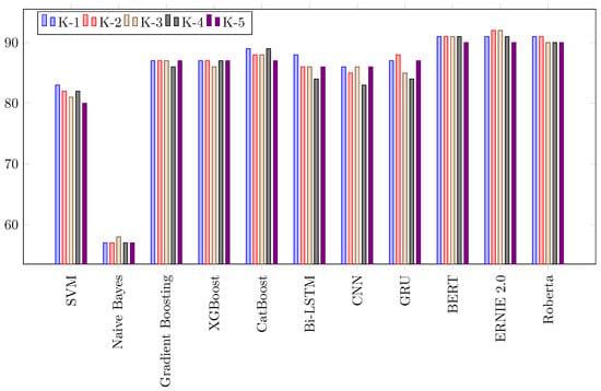 The k-fold cross-validation with all data (Combine_All as described in Section 3) segmented in into five folds. We split data into 80:20 splits for training and testing by ensuring the testing set did not contain any records from the training set. We applied transformers (BERT, RoBERTa and ERNIE 2.0) and DL algorithms (GRU, Bi-LSTM and CNN).