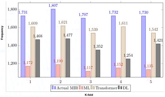 In Figure 11, we provided the average ensemble count (average of predicted labels for all models) of all the three classes corresponding to conventional ML, DL-based, and transformers. Additionally, we also reported a confusion matrix to verify the true-positive (TP), true-negative (TN), false-negative (FN), and false-positive (FP) classes for each fold. For example, the average ensemble count was the actual MIR value versus the predicted value for each fold (from 1 to 5), i.e., the true-positive (TP). The confusion matrix for ML, DL, and Transformers are listed in Table 5 and Table 6. For example, in k-fold, there were 1731 total MIR, whereas the average ML (i.e., the average of the predicted label of all the ML models) predicted 1172 TP MIRs, as well as 1468 TP MIRs for the DL-based and 1609 TP MIRs for the transformers. Similarly, for TNs, NB predicted the 64,722 TNs for ML. For DL, Bi-LSTM predicted 64,600 TNs, and for the transformers, BERT reported the highest 64,605 TNs values. For conventional ML, the average predicted value for all folds was 1153, with SVM having the highest share with 1499, which was lower than the predicted labels of 1731. The DL models showed better ensemble results with 1394 predicted labels for all folds, with CNN having the highest number of 1673 predicted labels. Transformers outperformed the conventional ML techniques with 1584 average predicted ensemble labels. RoBERTa performed best with 1693. Overall, the transformers models performed the best for the Combine_All datasets (Refer Figure 8).