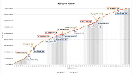 Our prediction horizon (meantime-to-resolve ) for MIR records from January 2020 to March 2021 is depicted in Figure 12. The blue line indicates the IOA records while the orange shows the MOA records. The IOA points (in orange) indicated the highest DateTime record where an incident log is generated. MOA denoted the point where we declared an incident as MIR. For example, ticket #20 had been reported to IOA on 30 April 2020 and labeled as MIR on 11 May 2020 by the outage team, so it took around 11 days to resolve this incident. Another ticket, #48, had been reported as IOA on 17 August 2020 and labeled as MIR on 27 August 2020, taking around ten days. In Figure 12, we noted that the orange line overlapped with the blue line, indicating the closing of the incident at the same instance. We predicted the average prediction horizon time of MIR as 4 days, 3 h, and 26 min, which could provide a significant advantage in addressing incidents and could prevent major incidents or outages.