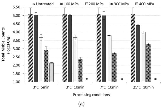 (a) Initial microbial load of untreated European sea bass fillets and after HP processing at different pressure–temperature–time conditions. (b) Microbial load of all tested microorganisms of untreated European sea bass fillets and after HP processing at different pressures and 25 °C for 10 min. Symbol (*) refers to non-measurable levels of microorganisms, i.e., <2.0 log CFU/g for TVC, Pseudomonas spp., and Brochothrix thermosphacta or <1 log CFU/g for Enterobacteriaceae spp., LAB, and H2S producing bacteria. Each bar shows the mean and the standard deviation of four replicates (n = 4).