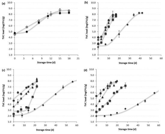 Growth of TVC of (a) untreated and HP-treated sea bass fillets at (b) 100–400 MPa/3 °C/5 min, (c) 100–400 MPa/3 °C/10 min, (d) 100–400 MPa/7 °C/10 min, (e) 100–400 MPa/25 °C/10 min, and (f) 100–400 MPa/25 °C/10 min—stored aerobically. Symbols indicate (●)—HP at 100 MPa, (▲)—HP at 200 MPa, (■)—HP at 300 MPa, and (♦)—HP at 400 MPa. Hollow symbols refer to aerobic storage of the fillets, while solid symbols refer to vacuum-packed fillets. Each point shows the mean and the standard deviation of four replicates (n = 4).