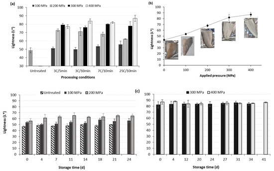 (a) Values of lightness (L*) of untreated European sea bass fillets and after HP processing at different pressure–temperature–time conditions, (b) visual appearance compared to lightness (L*) values of untreated and HP-treated fish fillets, and (c) evolution of lightness (L*) during storage for fish samples treated at different pressure levels at 25 °C for 10 min. Each bar shows the mean and the standard deviation of four replicates (n = 4).