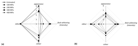 Radar charts of sensorial attributes of raw sea bass fillets (a) at day 0 and (b) at the end of the corresponding storage period for each sample. HP treatment was performed at 7 °C for 10 min. Each point value is the mean of eight replicates (n = 8 panelists).