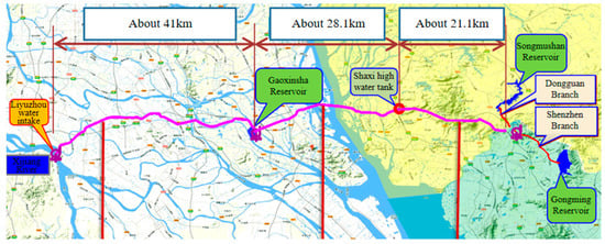 The layout of the water resources allocation project in Pearl River Delta is shown in Figure 1. The Nansha Branch line, which has a flow range of 5–13 m3/s, uses gravity self-flow water transmission and is designed to supply 13 m3/s. The shield tunnel length is 7.4 km and uses a single-line shield water transmission tunnel scheme. The concrete shield segment with inner and outer linings withstand internal and exterior pressure, respectively. The shield tunnel diameter is 4.1 m. The pipe piece thickness is 0.3 m and the inner diameter is 3.5 m. The lining C35 reinforced concrete thickness is 0.35 m. The tunnel water transmission inner diameter is 2.8 m. Moreover, there is a 1.2 mm waterproofing membrane put in between the pipe piece and the reinforced concrete. The composite liner must withstand a maximum internal pressure of 0.76 MPa under the conditions of the water transmission pressure of 0.7 MPa and surge pressure of 0.06 MPa.