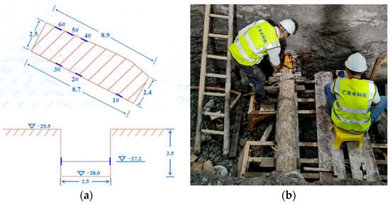 The deformation test of the pressure plate at the project site was carried out. The deformation modulus of surrounding rock under the water transfer and maximum test pressure is analyzed. A total of six tests were set up on the project site, with the test points placed on the side wall of a test pit. The location layout of the test site and the pressure plate test loading are shown in Figure 2. #1 to #6 represent test locations of the six pressure plate, respectively. The test pit’s long side forms a 105° angle with the shield tunneling direction; its top elevation is roughly 25.5 m; its depth is approximately 2.5 m. The elevation of the test center point is about 27.2 m. Its elevation outside the shaft is nearly 3.7 m. The diameter circular rigid pressure plate of 0.30 m was imposed by using a 20 t jack. The maximum test pressure of 2.1 MPa is about three times the design pressure.