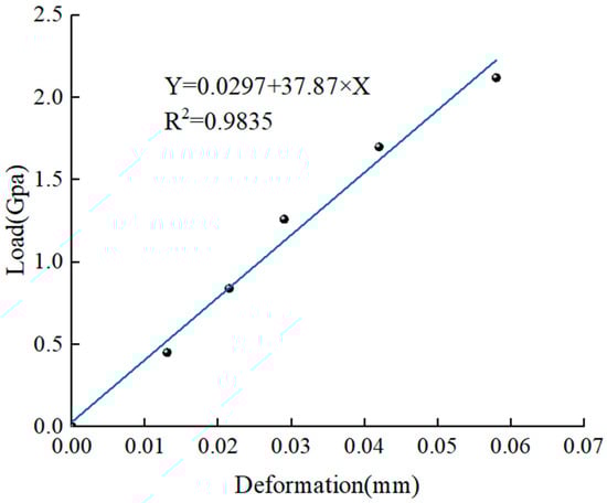 The results indicate that the fitting and the secant method are nearly identical to each other. According to statistical fitting method data, the deformation modulus of each test point under stress close to the water transmission pressure of the engineering design is 1.16~8.84 GPa, and the average value is 4.71 GPa. The deformation modulus calculated by the maximum test pressure is 1.31~9.60 GPa, and the average value is 4.69 GPa. The fitted curve of test point No. six at the highest point of test pressure is shown in Figure 3.
