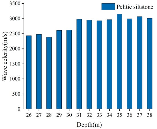 Each borehole bedrock section was subjected to in situ borehole television and acoustic wave tests. The development and integrity of the surrounding rock bedding are obtained through borehole television. The horizontal bedding of the surrounding rock is developed, and the integrity of the surrounding rock in the local hole section is poor according to the borehole television. The number of steep dip fractures is limited, but the width is large and there is a corrosion phenomenon. According to the acoustic wave test, the average wave speed of the lightly weathered muddy siltstone was 2813 m/s, with a range of 1515 to 4237 m/s. According to Liu [], the deformation modulus of the rock mass is related to the compressional wave velocity as a power function. To estimate the modulus of deformation, the borehole wave velocities of pelitic siltstone at different depths are calculated. The average wave velocity of pelitic siltstone at different depths is shown in Figure 4.