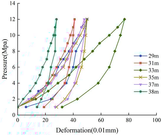 After the borehole TV and acoustic wave test, according to the Standard for Engineering Rock Test Methods (GB/T50266-2013) and the Rock Test Procedure for Water Conservancy and Hydropower Engineering (SL/T264-2020), the borehole deformation test was conducted in the test range. A total of 42 deformation tests were carried out along the surrounding strata of the working shaft. The equipment used for the borehole deformation test is the Changjiang Academy of Sciences’ CJBE91-I-type borehole elastic mode instrument. It is mainly composed of a pressurization system and a displacement testing system. In the test, two stiff pressure plates are pushed by four internal pistons to apply symmetrical strip stress to the borehole wall rock. The radial deformation of the borehole wall rock during loading is measured using displacement transducers installed in the pressure plates.
