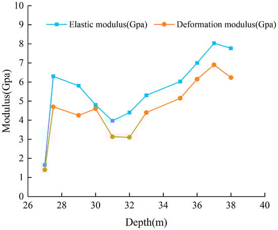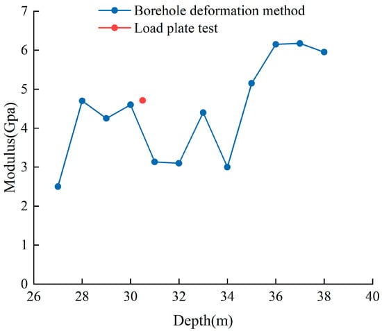 The comparison results of the borehole deformation method and pressure plate test at different depths are shown in Figure 8. The results of the borehole deformation method are similar to the load plate test results. The average value of the deformation modulus is 4.71 GPa in the pressure plate test. The average value of the deformation modulus measured by the drilling method near the same elevation (borehole depth is 30.9 m) of the pressure plate test point is about 4.6 GPa. This result indicates that the borehole deformation method and load plate test can be used to confirm each other. It further demonstrates the reliability of the deformation modulus obtained by the borehole deformation method.