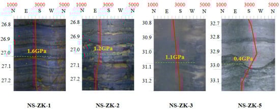 NS-ZK-1 and NS-ZK-2 are readily apparent to be a part of the stratified interlayer at this position. NS-ZK-5 represents the intersection of lithologies, the borehole deformation is minimal. NS-ZK-3 depicts that there is no crack through the TV, that is, the integrity of rock mass is good. The elevation is compatible with the results of the bearing plate test (30.9 m). Through borehole TV integration, the overall situation of the rock mass can be seen directly.