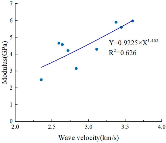 According to Liu [], it is known that the deformation modulus of the rock mass is related to the compressional wave velocity as a power function. The data measured in the field are fitted to the power function, as shown in Figure 9.