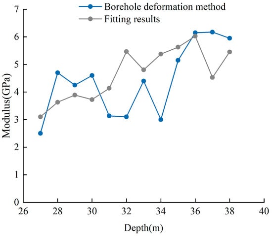 The deformation modulus is derived by fitting the formula based on the results of longitudinal wave velocity tests at different borehole depths. The comparison with the deformation modulus measured by the drilling method is shown in Figure 10.
