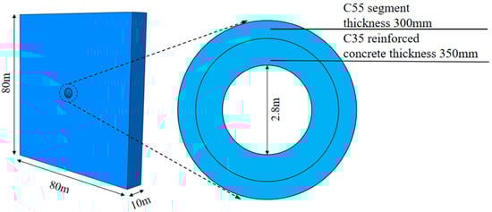 The numerical tunnel model was established by ABAQUS 6.14 software. The specific dimensions of the model are shown in Figure 11. The lining is double layered. The pipe piece sheet is made of C55 concrete. The reinforced concrete lining is made of C35 concrete and HRB400 reinforcement. All these materials use the linear elastic model, and the rock mass uses the elastic-plastic model based on the Mohr–Columba (M–C) principle. The C3D8P linear hexahedral unit represents the geotechnical layer, the shield tube sheet, and the lining concrete. The T3D2 3D truss unit is used to simulate the reinforcement. The total number of units is 25,730, and the number of nodes is 31,565. The load takes into account the gravitational field, and introducing the radial load inside the tunnel, simulates the internal water pressure. The top surface of the model is free. The left and right sides apply a head pressure that changes along the gravity gradient. The bottom surface is entirely fixed. The sides are restrained from normal deformation while vertical deformation is permitted. The physical and mechanical properties of the model are shown in Table 3.