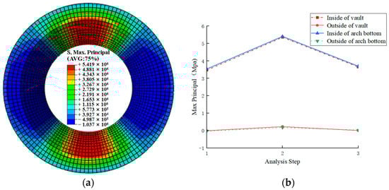 Stress characteristics of the lining. (a) Maximum principal stress of the lining. (b) Value of tensile part of the lining.