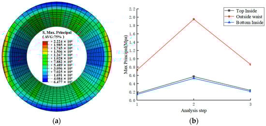The top of the pipe piece in the diversion tunnel is subject to tension on the inside and compression on the outside as water passage time increases, as shown in Table 5 and Figure 13. The maximum principal (tensile) stress on the inside gradually increased from 0.167 Mpa to 0.572 Mpa. The pipe piece’s ring arch waist’s stress changes are also more evenly distributed on both sides. The inner and outer sides of the waist experience compression and tension, respectively. The highest principal stress on the outer side raised from 0.730 Mpa to 1.953 Mpa. The maximum primary stress on the inside of the pipe piece increased from 0.143 Mpa to 0.529 Mpa under tension on the inside and compression on the outside. The outer edge of the tube sheet waist needs special care during long-term diversion tunnel operation since this area experiences increased tensile stress and is vulnerable to tensile cracking. The pipe piece can share the internal water pressure when the liner is subjected to internal water pressure, and the stresses of the pipe piece and liner tend to be uniform under the condition of sharing the stress. This causes the maximum primary stress at the pipe piece’s waist.