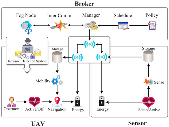 The proposed system consists of farms, unmanned aerial vehicles, deployed sensors, fog brokers, and fog nodes, as shown in Figure 2. The framework allows the simulation of large-scale farms with sensors deployed to monitor the farms, and UAVs are used to gather information periodically. The information is offloaded at the connected fog node through the fog broker. Moreover, the system detects malicious UAV behavior through a machine-learning model deployed at the UAVs. The main modules are elaborated on below.