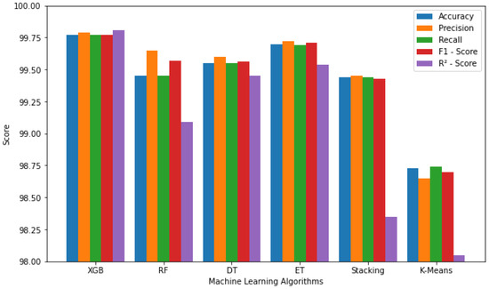For the effectiveness study, the proposed methodology is evaluated in terms of accuracy, precision, recall, F1 score, root mean square error, and R-squared score as evaluation metrics. The generated dataset is provided to the intrusion detection system that utilizes XGBoost random forest (RF), decision tree (DT), extra tree (ET), stacking, and k-means algorithms. The detailed results of the intrusion detection effectiveness evaluation are given in Figure 4. It can be seen that all algorithms perform well due to hyperparameter optimization with XGBoost showing the best results with 99.77% accuracy, 0.1055 root mean square error, and 99.81% R-Squared score. These results indicate that algorithms perform well and fit the data model. Further, XGBoost can handle large datasets. Therefore, performing classification or regression using XGBoost typically begins with an estimate, determines the similarities value, and obtains a tree for each potential threshold [68].