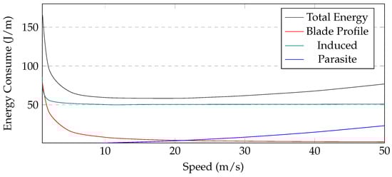 where , i = 1, …, 5, are the parameters for the energy model specified in [65] and is the blade profile power. is the induced power, and is the parasite power. The parasite power is the element needed to counter the parasite friction drag caused by the aircraft flying through the air, and the induced power is the element needed to counteract the induced drag produced during lift force to keep the aircraft in the air.