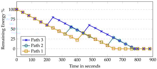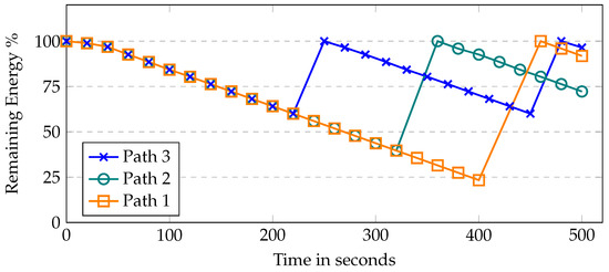 It is assumed that has two states namely active and passive. and are the energies consumed in the passive and active states, respectively. Therefore, the total energy consumed is given in Equation (1) [64]: