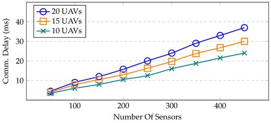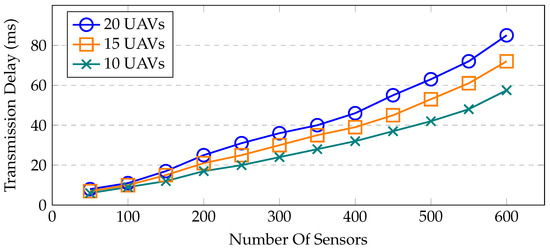 Transmission delay—the amount of time needed to send or receive a packet is called the transmission time or delay. When a UAV communicates with the sensor, it takes some time to receive the packets. The typical communication delay among UAVs and deployed sensors is seen in Figure 11. It is important to note that the delay grows as more sensors are placed. Due to the overlapping transmission ranges, several sensors attempt to interact with the UAVs, which causes increased channel congestion.