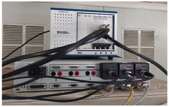 A laboratory setup has been prepared to test trigger conditions and signal timing. A Fluke 6100A was used as the PQ reference and configured to cyclically generate an AC waveform containing the sequence of PQ perturbations described in Table 3. The generator’s output was attenuated using a 1 probe to match the dynamic range of the PXIe-6124. The attenuated signal was then split and routed to both acquisition boards. This configuration allowed for checking the synchronisation of the digitised values from the two boards using different sampling rates.