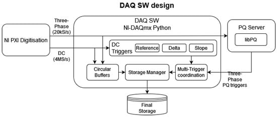 Triggering using the AC signals is based on the PQ analysis of the three-phase waveforms and is performed by sending the acquired samples to a PQ server that uses CIRCE’s libPQ library []. This library implements online Power Quality analysis following the stringent class-A requirements of the IEC 61000-4-30 [] standard. Using these PQ parameters, the server can trigger the acquisition by means of a TCP ad-hoc designed protocol. The PQ server is configured to evaluate the relevant PQ parameters (see Section 3.2). When some of these PQ parameters fall outside the allowed ranges, the PQ server sends back a signal to the DAQ program and stores the parameters causing that signal in a PostgreSQL database to trace the cause of the trigger and all the subsequent calculated PQ parameters.