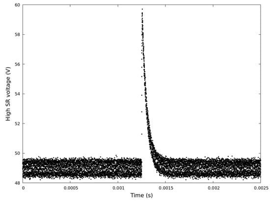 The synchronisation of both data acquisition boards was checked by comparing waveforms measured at high and low sampling rates. Data acquired at high frequency were subsampled and compared to those measured at low acquisition frequency. The differences of 120,000 samples were classified in bins of 0.01 V and plotted in a histogram, shown in Figure 6. The distribution shown in the figure shows that 99% of the difference values are lower than 0.18 V. This result is compatible with the absolute accuracy of the two boards [] combined with the voltage probe (calibrated in our laboratory).