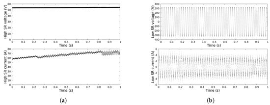 The digitiser is configured to use distinct sampling frequencies due to the different measurement requirements for the AC and DC signals. The study of the DC signals is the final objective of the measurement campaign. Then, DC signals are captured at the acquisition board’s maximum sampling rate (4 MS/s). AC signals are mainly used for triggering and evaluating PQ parameters. Then, a sampling frequency of 20 kS/s is enough for that purpose. This configuration is suitable for a synchronised acquisition because the high sampling rate is an integer multiple of the low sampling rate allowing for sharing the digitisation clock (PXI_Clk10 PXI clock), which links both triggers using integer dividers.