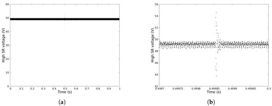The High Frequency digitiser system was installed in Málaga in October 2022. As indicated above, the system’s objective is to acquire signals with a high sampling frequency in an unattended manner to cover a wide variety of PQ events. For this reason, the configurable time window width of the triggers based on DC signals was chosen on significantly different time bases, as described in Table 4. The window width for the Reference DC trigger was chosen to match the half cycle of the 50 Hz grid voltage. In the case of the DC Delta trigger, the width of the time window was selected considering the ten/twelve cycle aggregation stated in the IEC 61000-4-30 standard []. Finally, the window width for the DC Slope trigger was adjusted to be able to capture fast signals such as transients and spikes. Table 4 also shows the chosen thresholds for unattended operation of the system. The DC Reference trigger thresholds were adjusted to be of the nominal bus voltage (48 V). The other two thresholds were empirically adjusted using manually captured data to avoid triggering with the baseline noise.