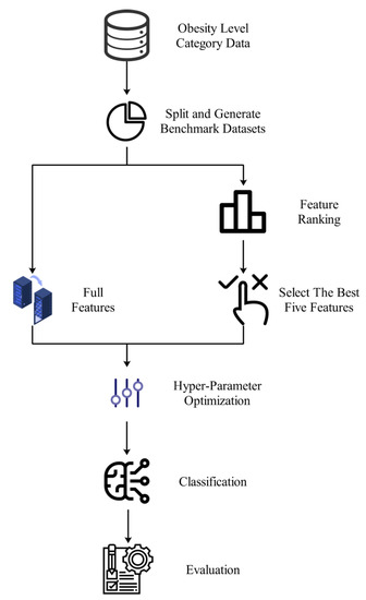 Early detection can result in rapid obesity prevention, and numerous strategies have been researched and evaluated to identify obesity trends. Current approaches to estimating obesity levels include machine learning (ML)-based classification analysis and risk factor (threshold)-based categorizations based on specific criteria. ML-based feature selection approaches and prediction models can identify links between risk factors for obesity. ML techniques can combine data from large patient groups to provide personalized predictions. For obesity, these techniques can be used to develop risk categories and da-ta-based guidance at the policy level. More specifically, ML can offer a patient-specific treatment method by clarifying the unique characteristics of each patient. In addition, individual evaluation of alternative treatments’ efficacy and possible side effects may guide treatment selection and patient follow-up. Predicting the risk of future obesity can provide relevant data and information on many individual variables using ML-based methods. Feature selection approaches are useful for better understanding the prediction results of ML models. With the contribution of these approaches, fewer important risk factors for diseases such as obesity are determined. Therefore, the information obtained from the results of a methodology combining feature selection and ML can be used in the diagnosis, treatment, and follow-up processes of patients [31,32].
