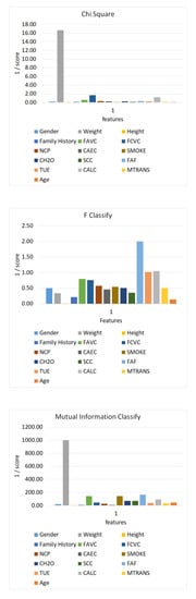 Another aim of this study was to measure the effects of the features used in the dataset to determine the obesity level. In the next phase of the study, feature ranking approaches were applied to our dataset to achieve this aim. For this purpose, the SelectKBest function from the feature_selection package of the sklearn library was used in Python software [42] with the trainForVal and testForVal datasets. The scores of the features, calculated by score functions, are shown in Table 5. In this table, a low score indicates that the effect of the feature is higher in determining the class.