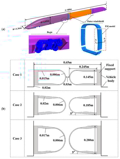 The geometric model of the HST used for the FSI calculation of the rubber external windshield of the train is mainly composed of three carriages (head carriage, intermediate carriage, and tail carriage) and two sets of rubber exterior windshields. The geometric streamline characteristics and bogie structure of the train model are retained, while the pantograph, door, window, and other parts are simplified. To better compare the aerodynamic effects of the three external windshield structure schemes and reduce the calculation amount, the calculation model only changes the external windshield structure, and sets the outer windshield side as an FSI model. The geometric model used for the numerical calculation is shown in Figure 2a. Figure 2b shows the structural sections of the outer windshield in three different schemes, and the three calculation models are defined as Case1, Case2, and Case3. Compared with Case 1, the sidewall distance of the U-shaped capsule in Case 2 is increased by 40 mm, the sidewall thickness is increased by 5 mm, and the sidewall has a 5° inclination angle with the train surface.