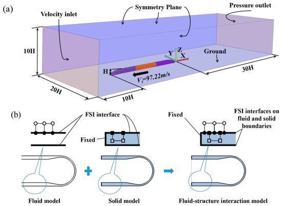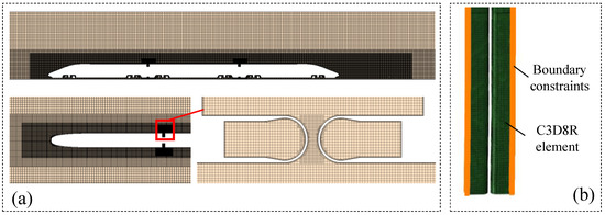In the FSI calculation, for reducing the influence of the fluid-domain boundary conditions on the airflow around the train, the height H (4.05 m) is defined as the characteristic dimension in this study; the length, width, and height are set to 60 H, 20 H, and 10 H, respectively. Additionally, the tip of the train nose is 10 H away from the velocity inlet boundary, and the train is 0.05 H above the ground. To ensure full development of the flow field at the rear of the train, the tip of the tail carriage is 30 H away from the pressure outlet boundary [10,16]. Figure 3 shows the boundary conditions and calculation area for the FSI simulation. The wall of the side structure of the external windshield is set as an FSI interface. The relative wind-speed method is used to simulate the relative motion between the train and airflow with given boundary conditions [30,31]. The uniform incoming flow velocity at the speed inlet boundary in front of the train is V = -Vt. To describe the characteristics of the incoming flow, the turbulent intensity of incoming flow in the calculation domain is 1% and the turbulent viscosity ratio is 10. Figure 3b shows the fluid–structure interface condition.