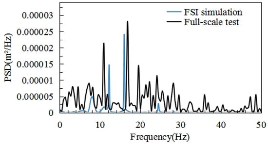 Figure 5 shows the surface pressure of the rubber external windshield at 350 km/h running speed, intercepted from the time-history curve for the full-scale test and compared with the surface pressure at the stable stage of the FSI calculation results. Figure 6 shows the main vibration frequencies for the dynamic response of the rubber external windshield structure under the aerodynamic force in the numerical simulation and the full-scale test. Through comparison, the main vibration frequencies of the rubber external windshield are similar. Table 2 compares the average pressure value for the full-scale test and numerical simulation together with the dominant frequency of the pressure fluctuation and the dominant frequency of vibration for the rubber external windshield. Compared with the full-scale test, the pressure and displacement results for the rubber external windshield structure obtained by the two-way coupling simulation method have definite consistency.