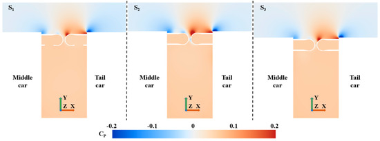 To obtain the initial flow-field characteristics of the external windshield without deformation and vibration response, the surface pressure distribution and flow-field structure around the external windshield between the middle carriage and the tail carriage are shown. Taking the rubber external windshield of Case 1 as an example, three horizontal sections of the external windshield with different spatial heights are selected. The heights of sections 1 to 3 from the ground are 1.5, 2, and 3 m, respectively, as shown in Figure 7. Owing to the good symmetry of the train body and the external windshield structure, the side structure of the external windshield was emphasized in the analysis of the initial flow field. The side part of the rubber outer windshield installed on the middle carriage was defined as W1, and the side part of the rubber external windshield installed on the tail carriage was defined as W2.