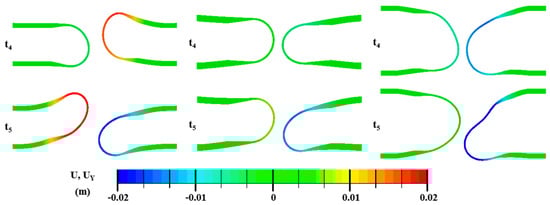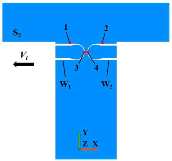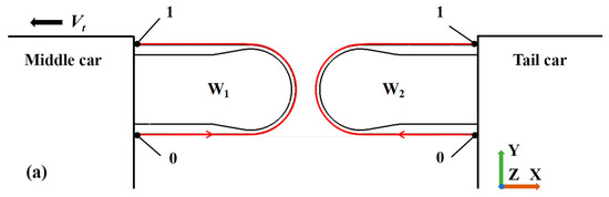 To analyze the FSI characteristic between the windshield structural dynamic response and the air flow around the carriage connection, the FSI calculation for the rubber external windshield in Case 1 is taken as an example to show the relationship between the deformation movement and the force acting on the external windshield. Figure 15 shows several characteristics of the surrounding flow-field movement and structural deformation movement during the reciprocating vibration period for the rubber external windshield. Figure 15a shows the initial flow-field state before the external windshield is deformed. It can be seen that the air enters the cavity between the external windshield and the internal windshield along the top arc of W2 and flows clockwise along the vehicle body end wall. The air exerts pressure on the W2 windshield toward the cavity and thrust on W1 toward the outside of the vehicle body. Under the action of aerodynamic force, W1 and W2 form deformation and dislocation. W1 deforms to the outside of the vehicle body and reaches the maximum displacement of eversion. W2 deforms to the inside of the vehicle body. At this time, air in the cavity flows out along the arc at the top of W1, as shown in Figure 15b. When W1 turns outward to the maximum displacement, the elastic force is the largest, and the air in the cavity flows out, causing the pressure in the cavity to drop, so W1 rebounds, as shown in Figure 15c. When W1 rebounds to the initial state, owing to the inertial force, it continues to deform a certain distance to the inner side of the vehicle. At this time, the air continues to enter the cavity along the arc at the top of W2, as shown in Figure 15d. In this way, the aerodynamic force interacts with the outer windshield structure to form a typical periodic vibration process.