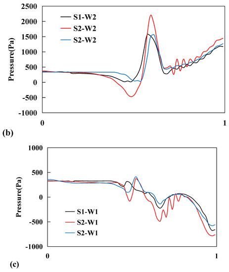 Figure 8 shows a cloud diagram of the time-average pressure distribution on one side of sections 1 to 3 in the initial flow field. Figure 9 shows the pressure distribution on the outer contour line of the windshield in sections 1 to 3. The inner side of the windshield is defined as the starting point, and the pressure distribution laws on the three sections at different heights are quantitatively displayed along the outer contour line of the windshield. According to the principle of relative wind speed, the W1 capsule dome is on the leeward side and the W2 capsule dome is on the windward side, determined by comparing the cloud diagram of the time-average pressure of the different height horizontal sections shown in Figure 8. Since there is an installation distance of 20 mm between the vehicle body and the outer windshield, when the air flows through the connection between the vehicle body and W1, a negative pressure area is generated, and when the air flows through the connection between W2 and the vehicle body, a positive pressure and negative pressure area are formed. The sidewall of the windward side W2 is affected by positive pressure, while the sidewall of the leeward side W1 is mainly affected by negative pressure. With the change in the section height, the pressure distribution around the outer windshield is quite different. In S2, the positive pressure on the outer wall of W2 and the negative pressure on the outer wall of W1 are greater than S1 and S3, and there is a small negative pressure area at the arc position outside W1 and at the top of the arc of W2. Figure 9 shows the quantitative results of the pressure distribution on the outer surface of the windshield at three different height sections. It can be seen from the comparison that the pressure distribution on the inner wall surface of the outer windshield of sections 1 to 3 is similar and positive. The change in height mainly affects the top of the capsule arc of the rubber external windshield, and the pressure environment of S2 is worse than that for S1 and S3. Since section S2 is located at the widest position of the vehicle body, the airflow is less affected by the ground and the vehicle roof, and the airflow rate here is fast, resulting in a higher negative pressure distribution on the outer side of W1 and a higher positive pressure distribution on the outer side of W2 than on the other two sections.