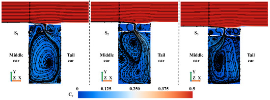 Figure 10 shows the time-averaged flow-field structure of sections 1 to 3 in the initial flow-field state. Through comparison, it can be concluded that the air flows into the cavity between the exterior windshield and the interior windshield through the camber and gap of the exterior windshield and produces a relatively high-speed rotary movement in the cavity. With the change in train height, the flow-field structure of the three sections has different changes. It can be seen from S1 and S2 that the air flows into the cavity from the gap and rotates clockwise with respect to the center of the cavity. Relative to the time-averaged velocity field of S1, the main vortex at S2 moves outward to the windshield and forms multiple vortices in the cavity. The airflow direction at S3 is opposite to that at S1 and S2, and the airflow at S3 rotates counterclockwise with respect to the center of the cavity. From this point of view, between S2 and S3, the outer windshield structure is subject to the shear action generated by the fluid, which is very unfavorable for the safety of the outer windshield structure.