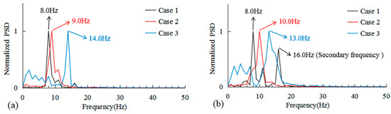To compare the dynamic response characteristics of the rubber external windshield in the three schemes, the frequency spectrum of the two time stages of the displacement curve is analyzed. Figure 13 shows the power spectral densities (PSD) for d1, d2, d3, and d4 at the initial stage of windshield vibration for the three schemes. Figure 14 shows the power spectral densities for d1, d2, d3, and d4 in the vibration response stability stage of the rubber external windshield for the three schemes.