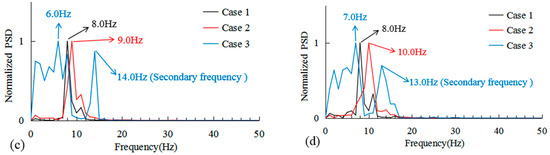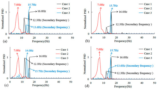 PSD in the vibration response initial stage: (a) d1, (b) d1, (c) d3, (d) d4.