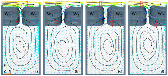 Characteristic morphology of flow-field movement and structure deformation during the vibration period: (a) initial state before vibration, (b) maximum displacement state of W1 eversion, (c) intermediate state of W1 rebound, (d) maximum displacement state of W2 eversion.