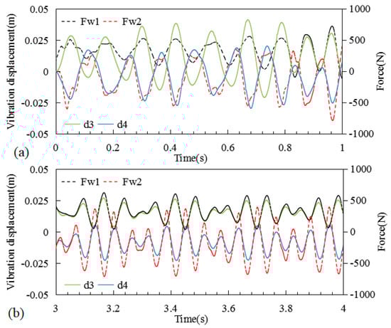 The relationship between displacement and resultant force in the initial and stable stages of vibration: (a) initial stage of vibration, (b) stable stage of vibration.