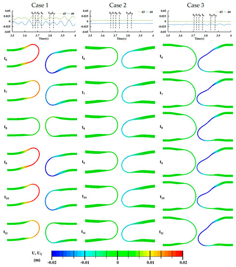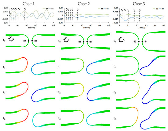 Figure 17 and Figure 18, respectively, show the initial and stable vibration stages of the outer windshield for the three schemes, the relative displacements of d3 and d4 at different time nodes, and the deformation patterns of several time nodes for the outer windshield at S2 in the vibration periodic.