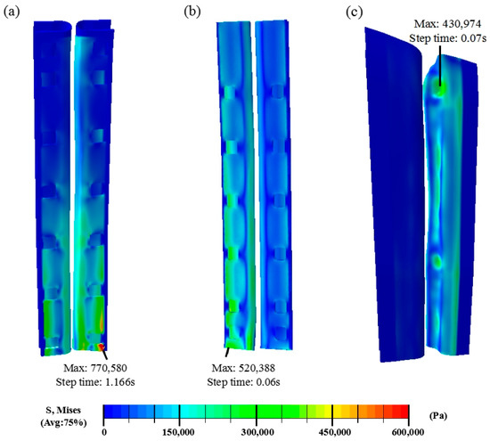 For the three schemes, Figure 19 shows a comparison of the maximum stress distribution in the dynamic response process for the rubber external windshield side. It can be observed that the stress in Case 1 is mainly concentrated at the lower process hole and the fixed support during the vibration response of the rubber external windshield, and the stress value is significantly higher than that in the other two schemes. Since the vibration patterns of Case 1 and Case 2 are the same, the stress concentration positions of the two schemes are close. Because the top of the arc in the rubber external windshield structure for Case 3 is weak, the deformation at the top of the arc under the action of aerodynamic force is the largest. The stress concentration location is mainly distributed on the top of the rubber outer windshield on the windward side, and the stress near the roof is greater than other locations.