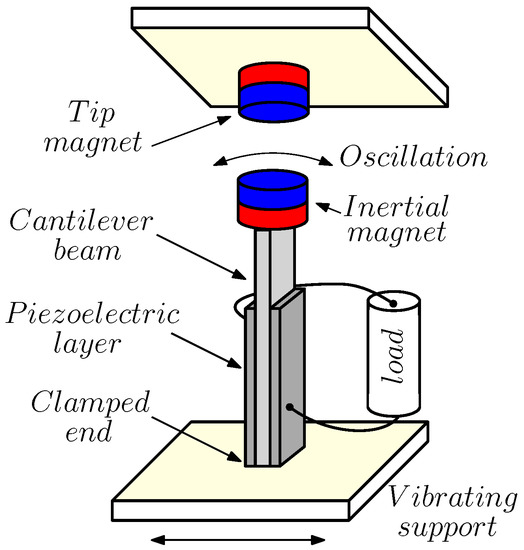m at the opposite end to amplify oscillations. Vibrations of the support induce oscillations of the beam that in turn are transformed into electrical power by means of layers of a piezoelectric material deposed on the cantilever. Nonlinearity is introduced in the design by the tip magnet, that is fixed to a support in front of the inertial magnet but with opposed polarities, to create a biased inverted pendulum with magnetic repulsive force. When the two magnets are close enough, magnetic repulsion forces the beam to the left or to the right of the vertical position. The unforced system exhibits bi-stability, with two stable equilibrium points, each with its own basin of attraction, separated by an unstable saddle, corresponding to the vertical position.