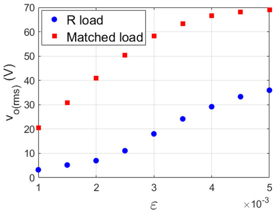 Figure 5 shows the root mean square output voltage as a function of the noise intensity. Red squares refer to the energy harvester with matched load with optimal values of the circuit components given above. Blue circles refer to the energy harvester with a simple resistive load. The output voltage was obtained from the numerical integration of the SDEs system using the stochastic Runge–Kutta method. For each value of the noise intensity, we averaged over 20 simulations, each one with a different realization of the noise process, with time length