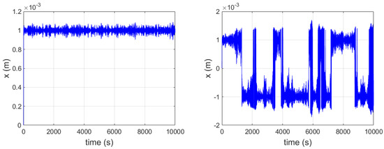 , the beam–inertial mass system remains confined in the right potential well, vibrating around the equilibrium position with small amplitude. On the right, for